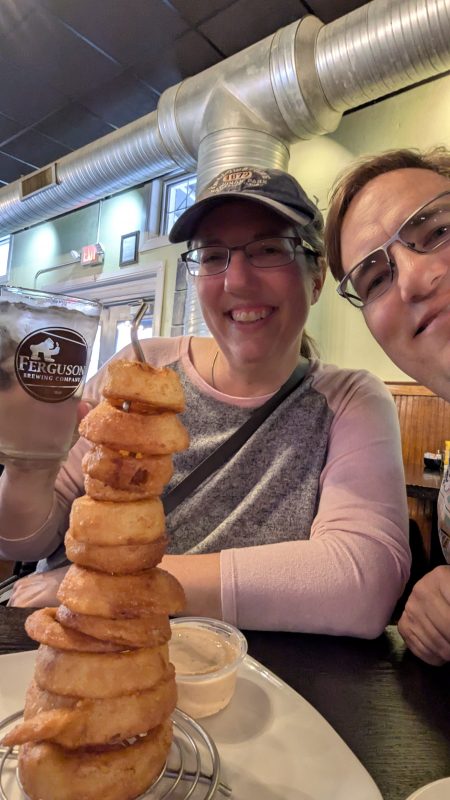 Our prize for the walk was dinner at Ferguson Brewing Company. Danelle likes onion rings so we got the appetizer before dinner to go with our beers.