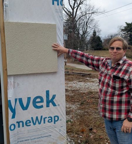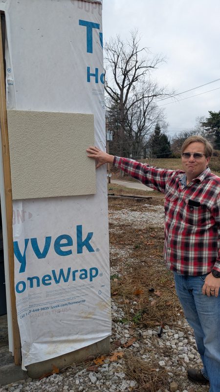 We also met the builder and the vendor selected to put the exterior EIFS on the house. Follow the link if you want more details, but its basically a different version of stucco. It’ll have a finish to provide the Southwest/Mediterranean look and feel. Below is me holding a sample of it up against the garage.