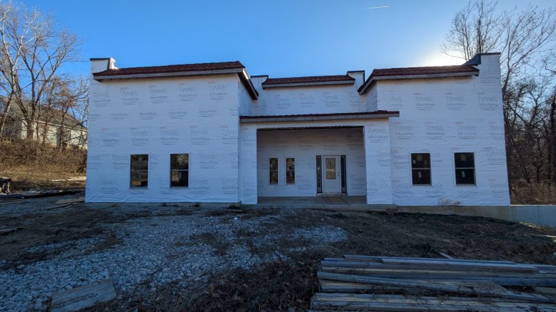 On a previous update, I mentioned that the EIFS vendor came out and looked at the house. It turns out that EIFS needs a different type of Tyvek on the house. This new version is “StuccoWrap”. Its actually ribbed with an up and down direction. The design is supposed to help with adhesion and draining of water that gets behind the EIFS. Maybe it turns out it was good to wait on fixing the Tyvek, but it doesn’t make it any less frustrating. Below is the front of the house properly wrapped. It gives a feel for what the house will look like when finished and we’re liking it.