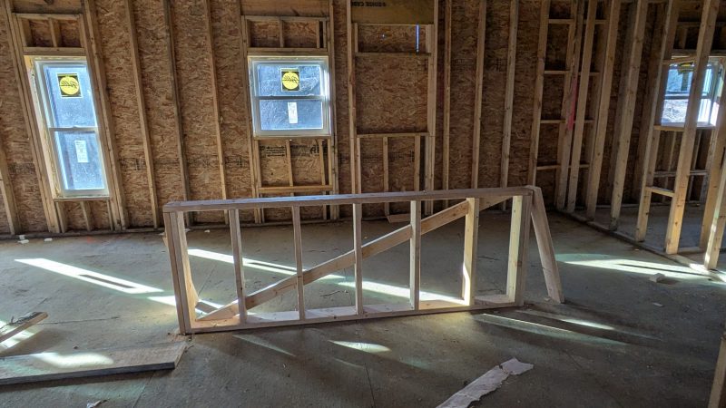 On the inside, some work was done on the kitchen. Large islands are built out of regular kitchen cabinets. If you want to put electric or water in them [we want both], then you need a wall in the middle to put them. They installed a 2×6 wall that the cabinets will mount up to. This will hold the utilities without putting many holes in the cabinets. To my surprise, they cut holes in the floor and affixed them to the floor joists and it is very secure!