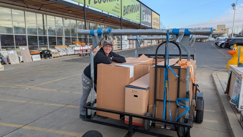 We purchased bathroom vanities from a local store and they came in stock. They don’t delivery but do have people that subcontract deliveries. It was going to be at least $200 to get them delivered. Since Danelle and I are capable of doing this, we decided to save the money and pick them up directly. We drove the RAV4 with the trailer to the store and got 3 vanities in the trailer and one inside the vehicle.
