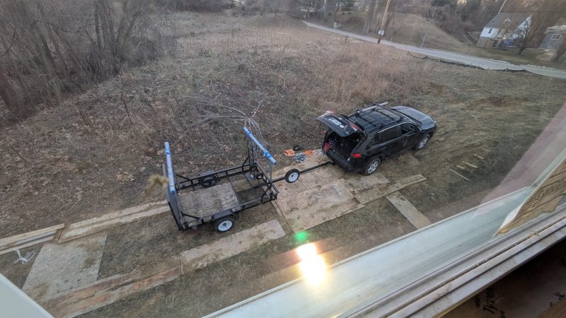 There are actually 4 boxes in the trailer, the middle one is the in stock vanity top. The other 3 vanity tops are on order still. We wanted to put all of this in the basement so its out of the way of construction. This meant backing the trailer down as far as I dared to the back doors. This is the same location the lift got stuck and had to wait for the ground to freeze. I backed all the way down with the trailer. Danelle watched and let me know that one of my tires came off the ground on the RAV4.