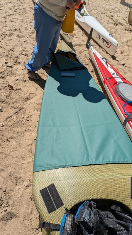 At the finish line, I was admiring Dana’s apray skirt that his wife made for his canoe.