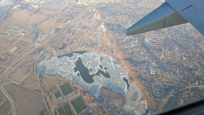 Now that we’re through security, I’m calming down. If you couldn’t tell, security is not my thing. My preference would have been to drive to San Diego… Anyway, after walking in the airport to get lots of steps and not be bored, it was time to board the plane. Things went great. Danelle blessed me with her window seat. I was able to look out until the clouds prevented it. It was cool to see Creve Coeur Lake iced over. I paddle a lot on this lake when its not frozen, hence it being important enough to photograph.
