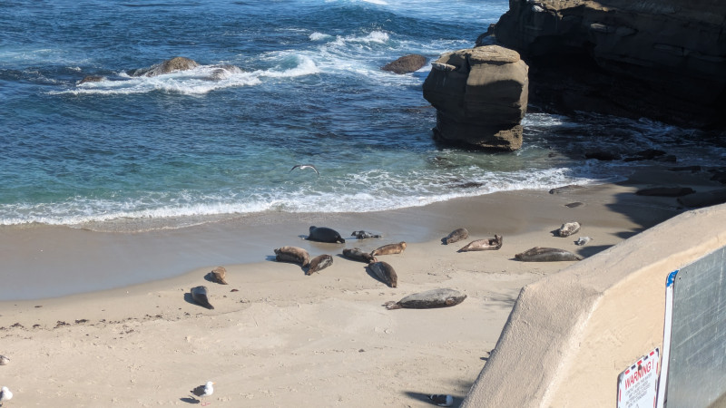 When we had our fill of the rocks, we walked on. The beach ended and we had to go up to the road. This wasn’t bad as it quickly lead us to our second point of interest, seal beach. I was worried we would miss the seals, but they were there just hanging out for us to view along with many other people. The seals and birds were everywhere on the beach. Normally visitors can go down to the beach, but because the seals had young pups, it was closed to visitors.