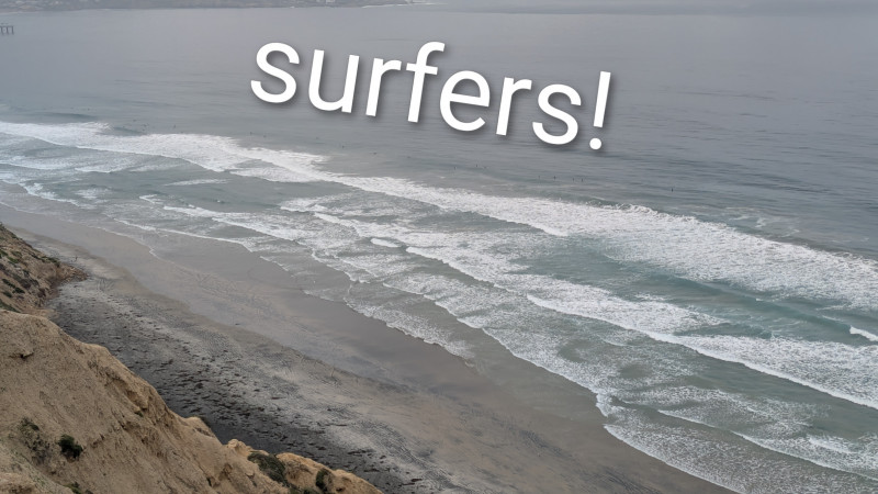 After I came out, Danelle had camp set up (unloaded her bag) and was happily resting. I decided to walk further up the beach for steps and curiosity. Ahead was Black’s Beach. It’s a large nude beach and I had never been to one before. I knew I was there when I saw a guy proudly walking down towards me with nothing on. The other benefit of this walk was scoping out how to get off the beach when we were done. I found a long paved road that the lifeguard trucks use to come down to the beach.