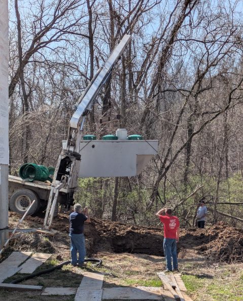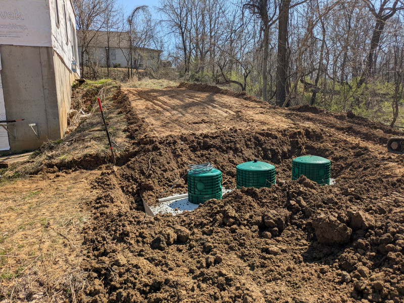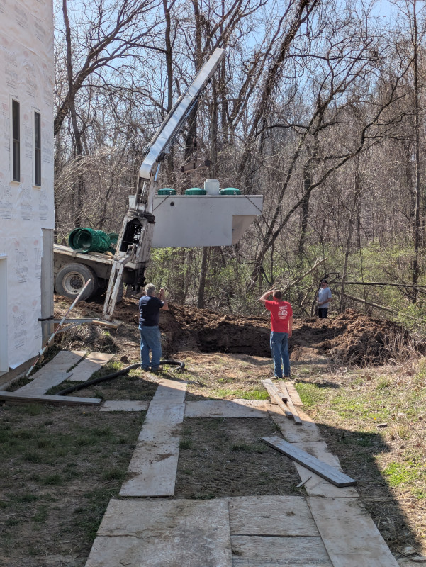 Finally, they will clear out a 100′ run through the woods for the field to drain the tank out. Its one of the few projects that is fully complete and we’re happy for it to be ready. Actually, I take that back. Look close at the photo above and on the left most green cap, there is a bunch of wire. I got a phone call a few days after the install. It turns out the system comes with a 2 year service contract. The company servicing the unit wants to come out about 2 weeks before we move in. The middle chamber of the tank requires an aerator to accelerate the breakdown of the waste. The warranty starts the day it is installed. That means they don’t want to install it until close to when we’ll start using it. This means we just need to call before we move in for them to install the last piece. The wire is for electric to power it. But its all paid for, meaning its technically finished.
