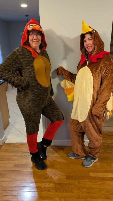 We convinced Kelly to come over and participate in the Turkey Trot this year. Of course we had a spare costume for her to add to the fun!